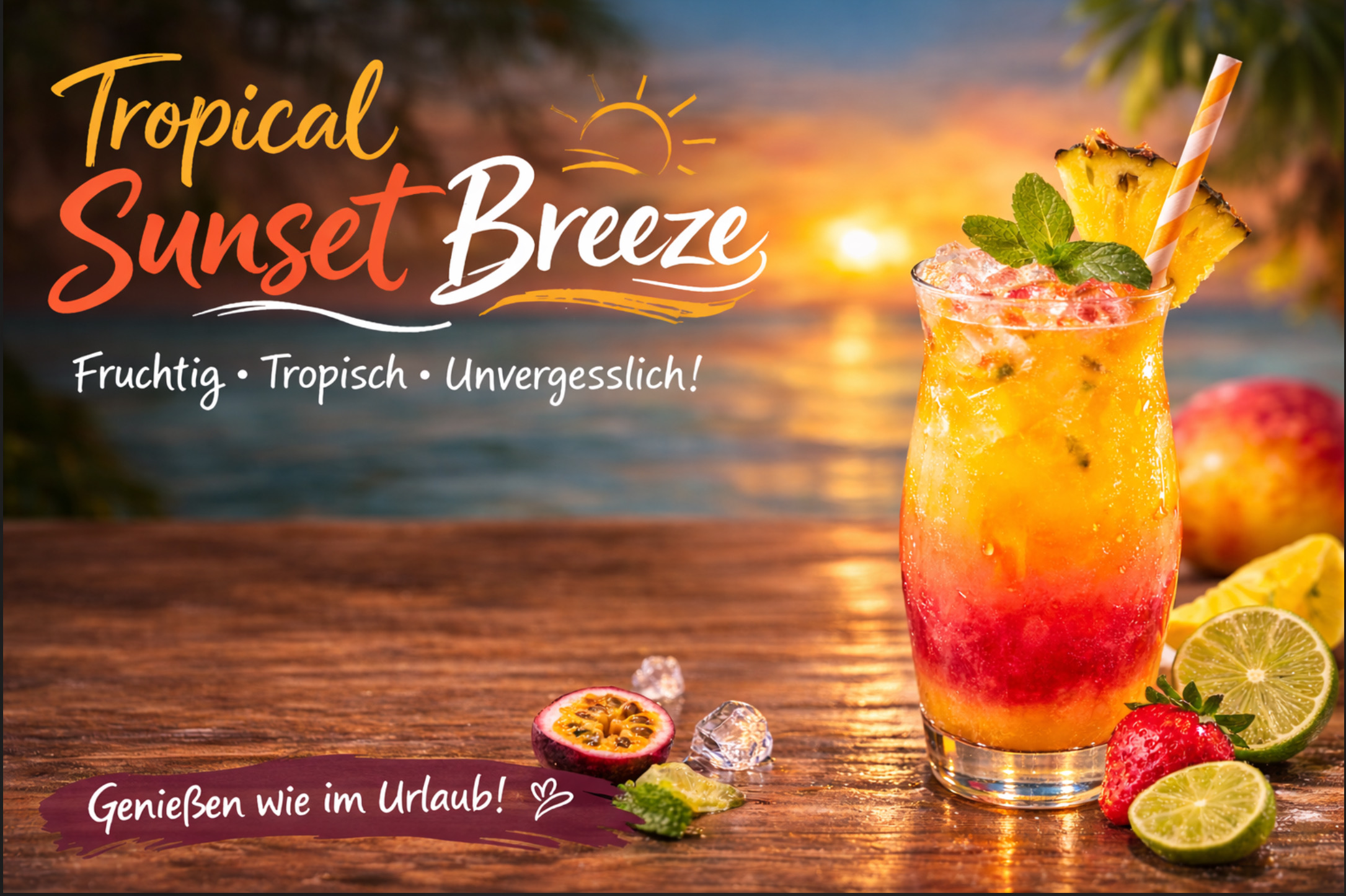Der Tropical Sunset Breeze ist somit ein fruchtiger, farbenfroher und leicht zuzubereitender Cocktail, der mit seinem tropischen Geschmack und seiner besonderen Optik an Urlaub, Sonne und Strand erinnert.